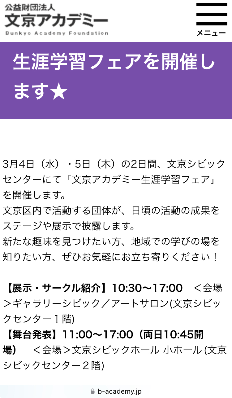| 問い合わせ先 | <展示・サークル紹介部門>アカデミー文京 学習推進係 03-5803-1119(平日9~17時) 、チラシに記載の連絡先090-6511-6889 |