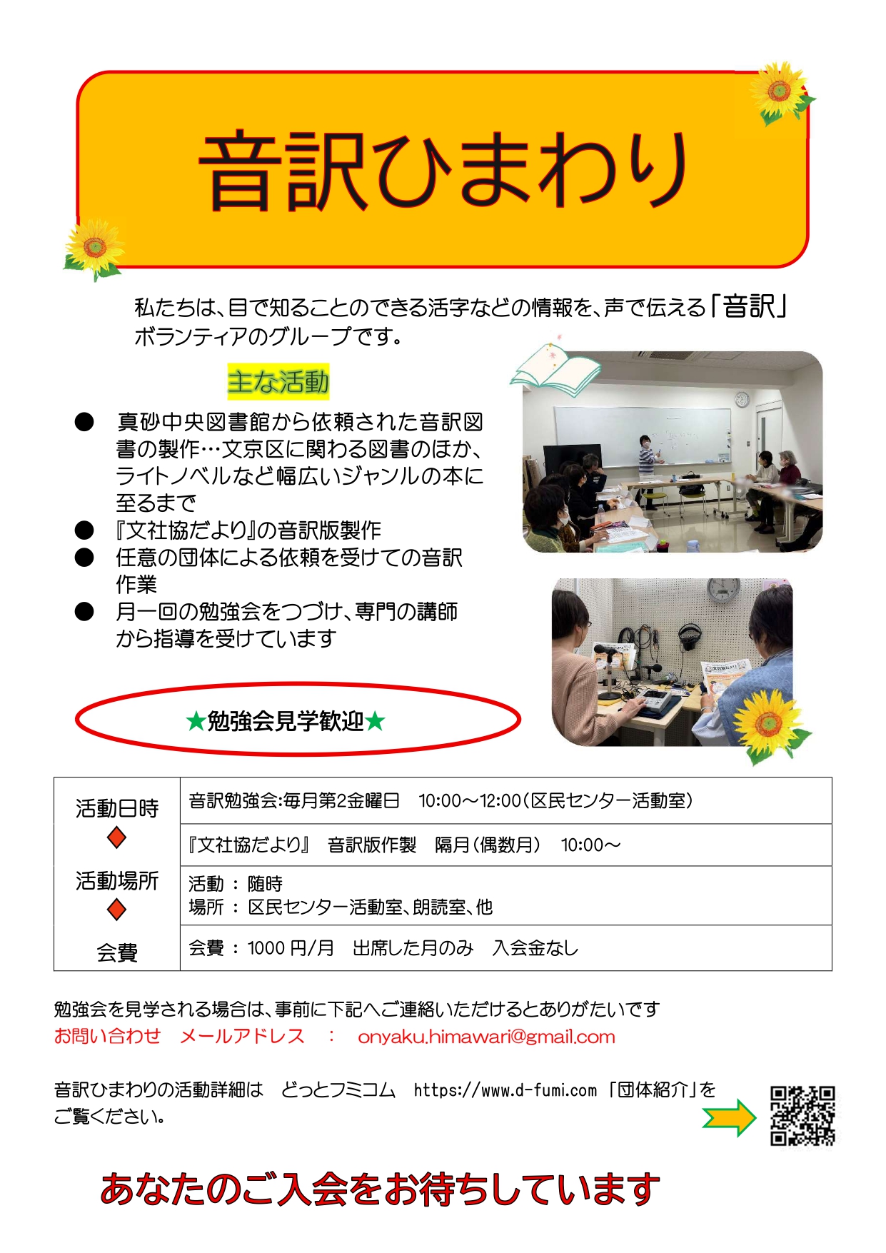 私たちは視覚障害者、高齢者の方々のために音訳を行っているボランティアグループです。