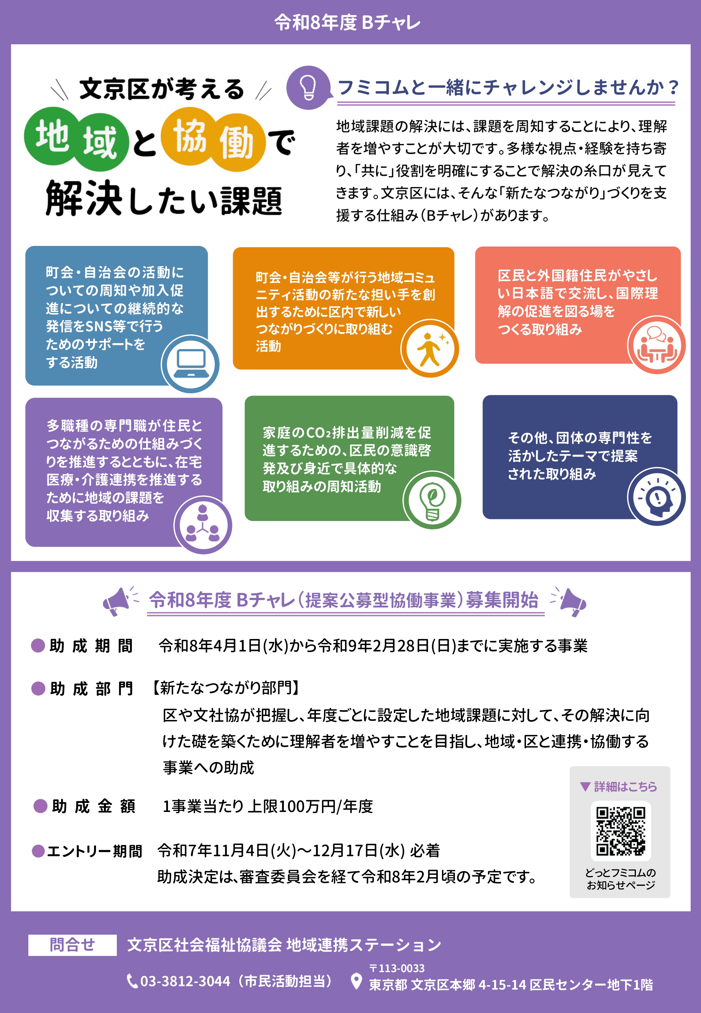 文京区社会福祉協議会(以下、文社協)は、地域連携ステーション フミコム(以下、フミコム)の目的である「新たなつながりを創出し、地域の活性化や地域課題の解決を図るための協働の拠点」の体現化を目指しています。「Bチャレ」では、ボランティア・NPO・企業・行政・学生(学校)・ソーシャルビジネス等による地域課題解決の事業、解決に向けて協働をするためのチャレンジに対する活動に助成します。