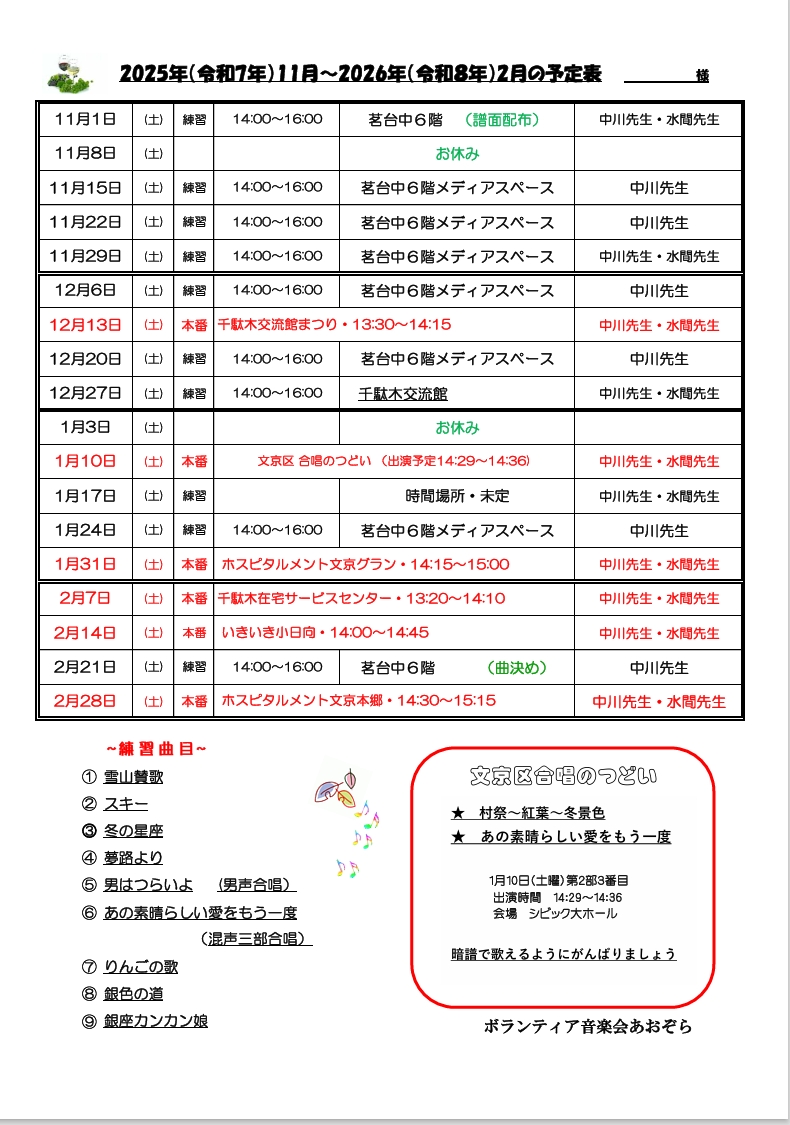 ボランティア音楽会あおぞら 2025年11月~2026年2月の予定表